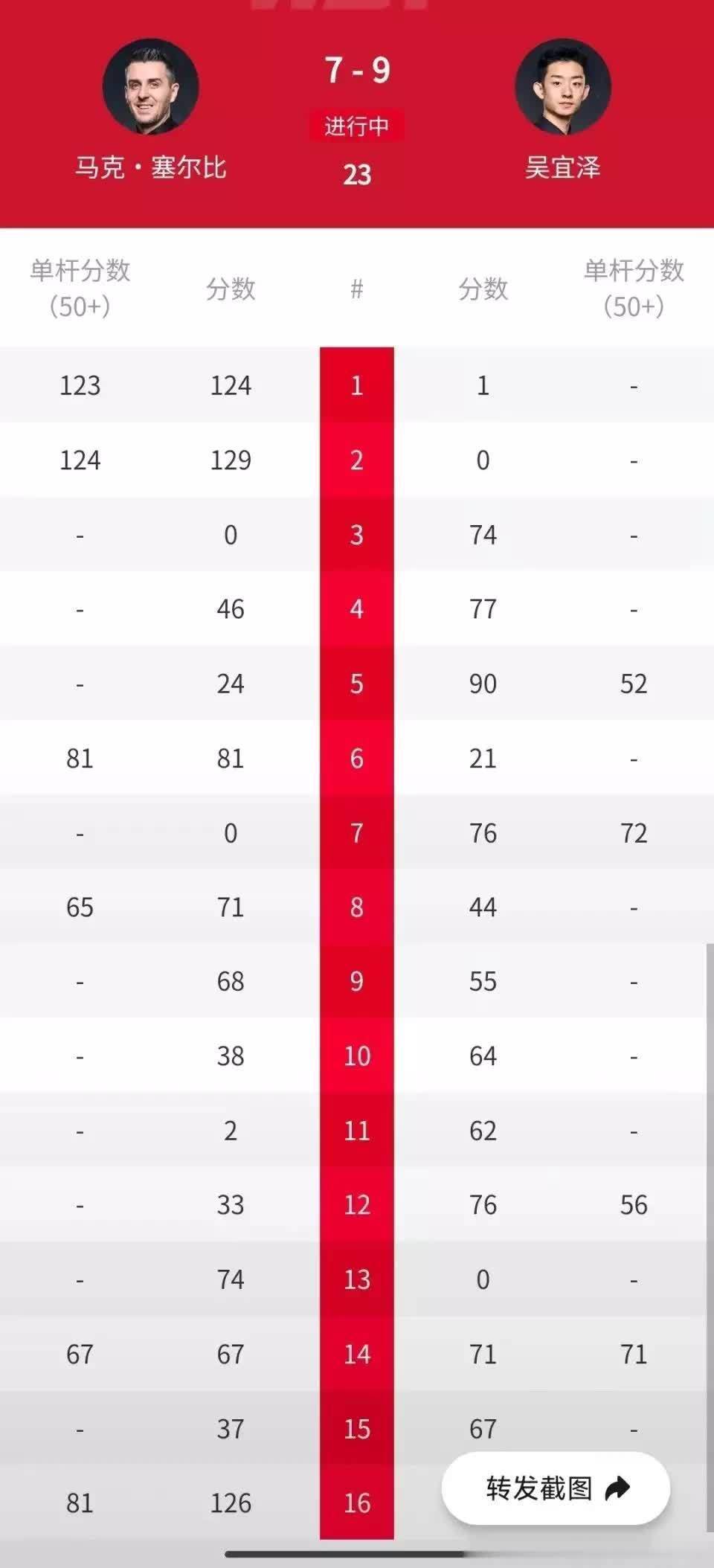 这场比赛第一阶段,作为世锦赛冠军的塞尔比开场率先发力,他连续轰出单杆123分、124分,2-0霸气开局。第三局,吴宜泽扳回一局,比分追成1-2。接下来的比赛,双方打得依旧胶着,第一阶段比分是4-4。