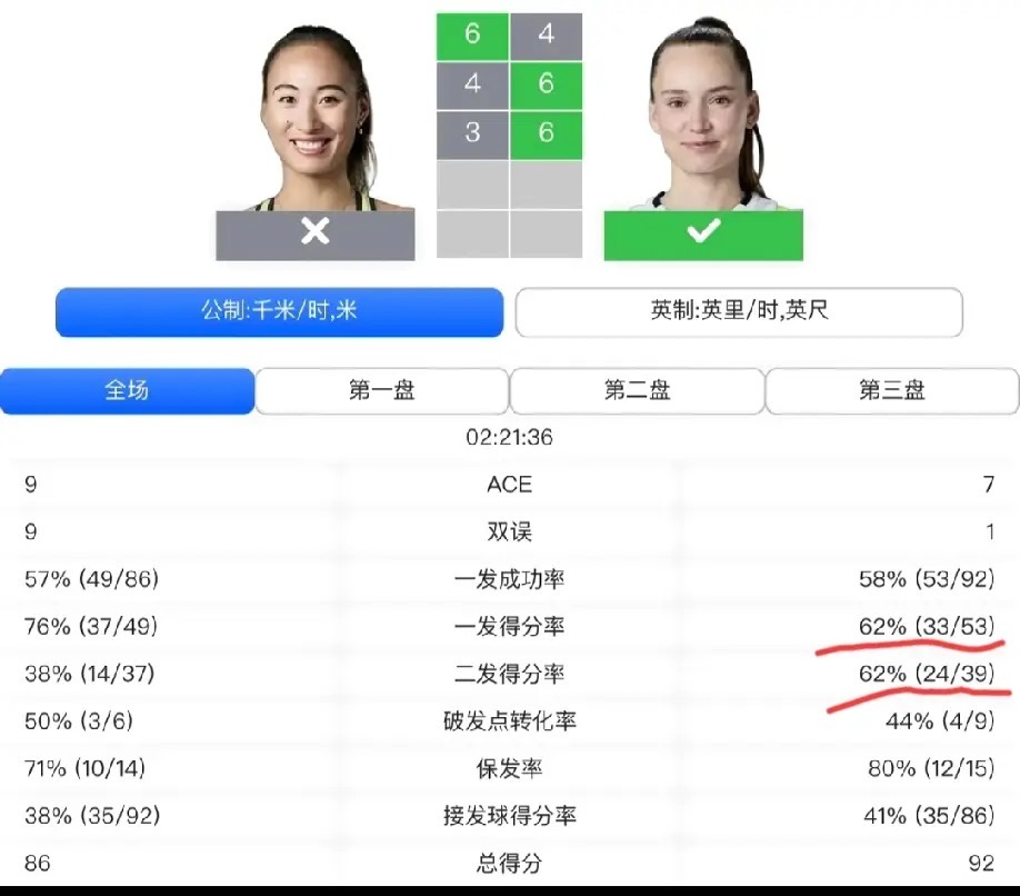 有人说,郑钦文那9个双误是致命性错误,为她最后的落败悲剧提前埋下了伏笑。有人则表示,这话有一定道理,却并不能将之当成郑钦文输球的绝对原因,导致郑钦文最后被逆转,还和她自身过多的非受性失误,以及在接发球和二发方面对莱巴金娜的压迫感做的不够到位有关。虽说跑动比首秀对阵肯宁做的要好,但是仅这方面有提升,想战胜莱巴金娜还远远不够。